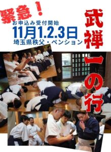 あっという間に秋、10月だ。暑すぎた夏が長すぎだったから、突然「秋」という感じになったのだろう。 息子との作業やスズメバチ退治も終わり「武禅一の行」の最終的な宣伝になった。後6人空席があるので、そこを埋めたいのだ。 日曜 […]